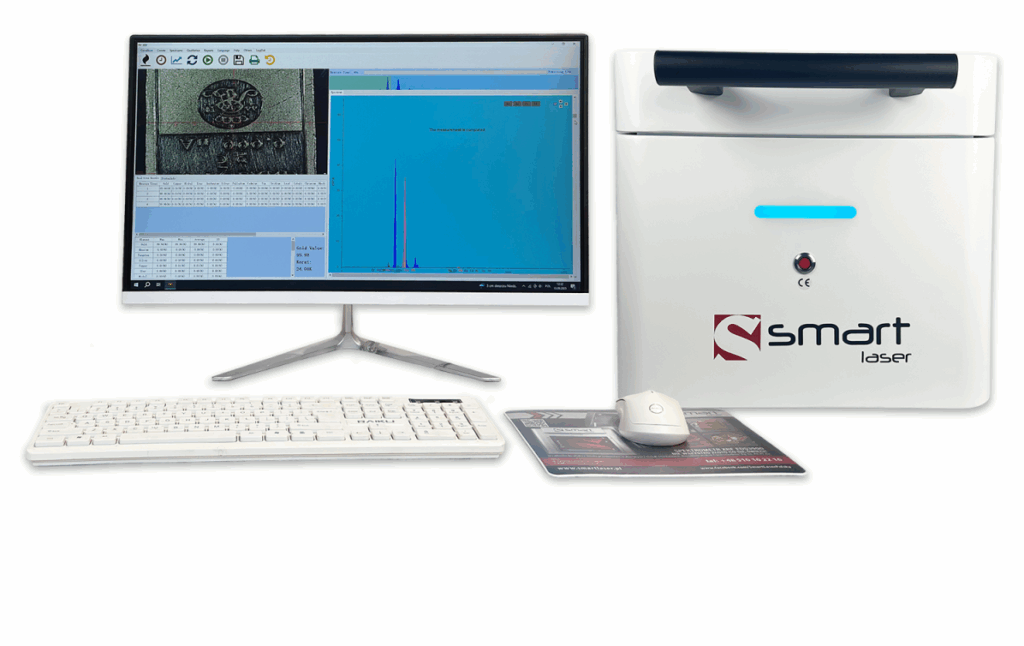 Spektrometr XRF (fluorescencja rentgenowska) umożliwia nieinwazyjne badanie składu chemicznego biżuterii. Urządzenie w kilka sekund odczytuje procentową zawartość pierwiastków w stopie, wskazując realną próbę złota oraz obecność innych metali szlachetnych (np. srebra, platyny, palladu).