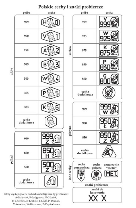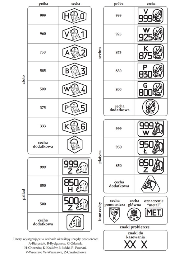 Każdy wyrób z metalu szlachetnego (z wyjątkiem określonych zwolnień wagowych) musi posiadać znak probierczy, który składa się z: