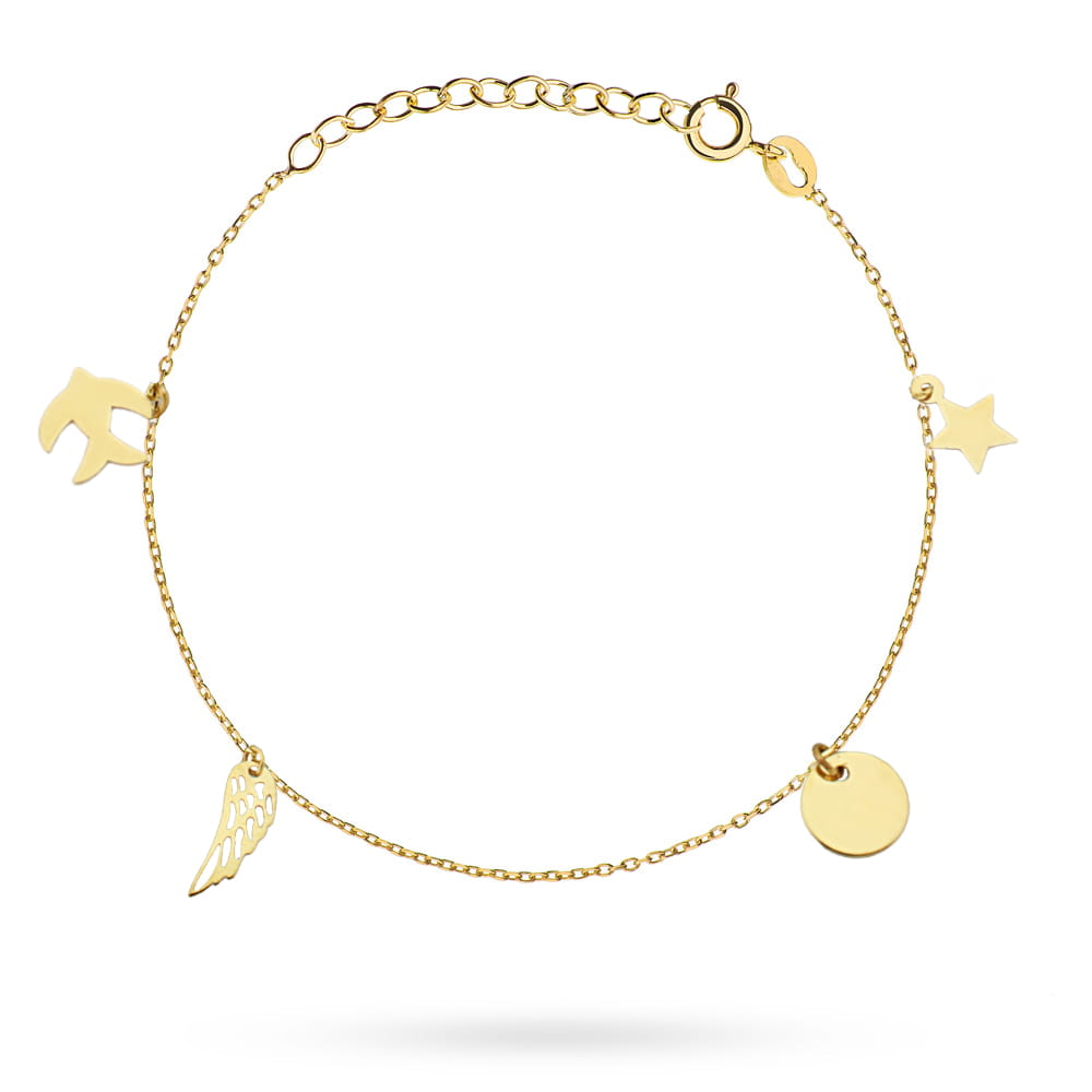Precyzyjnie wykonana złota bransoletka próby 585 z gwiazdką, kółkiem, skrzydełkiem i jaskółką. Świetnie sprawdzi się jako dodatek do codziennych stylizacji.