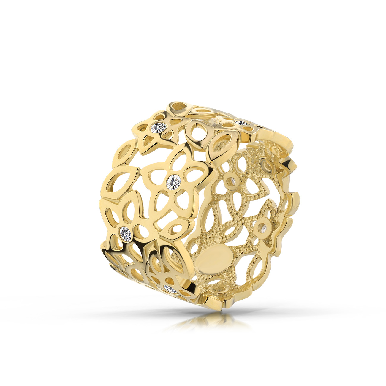Stylowy pierścionek będący doskonałym wyborem dla osób ceniących jakość i estetykę. Subtelny połysk kamieni pięknie współgra z kolorem złota.